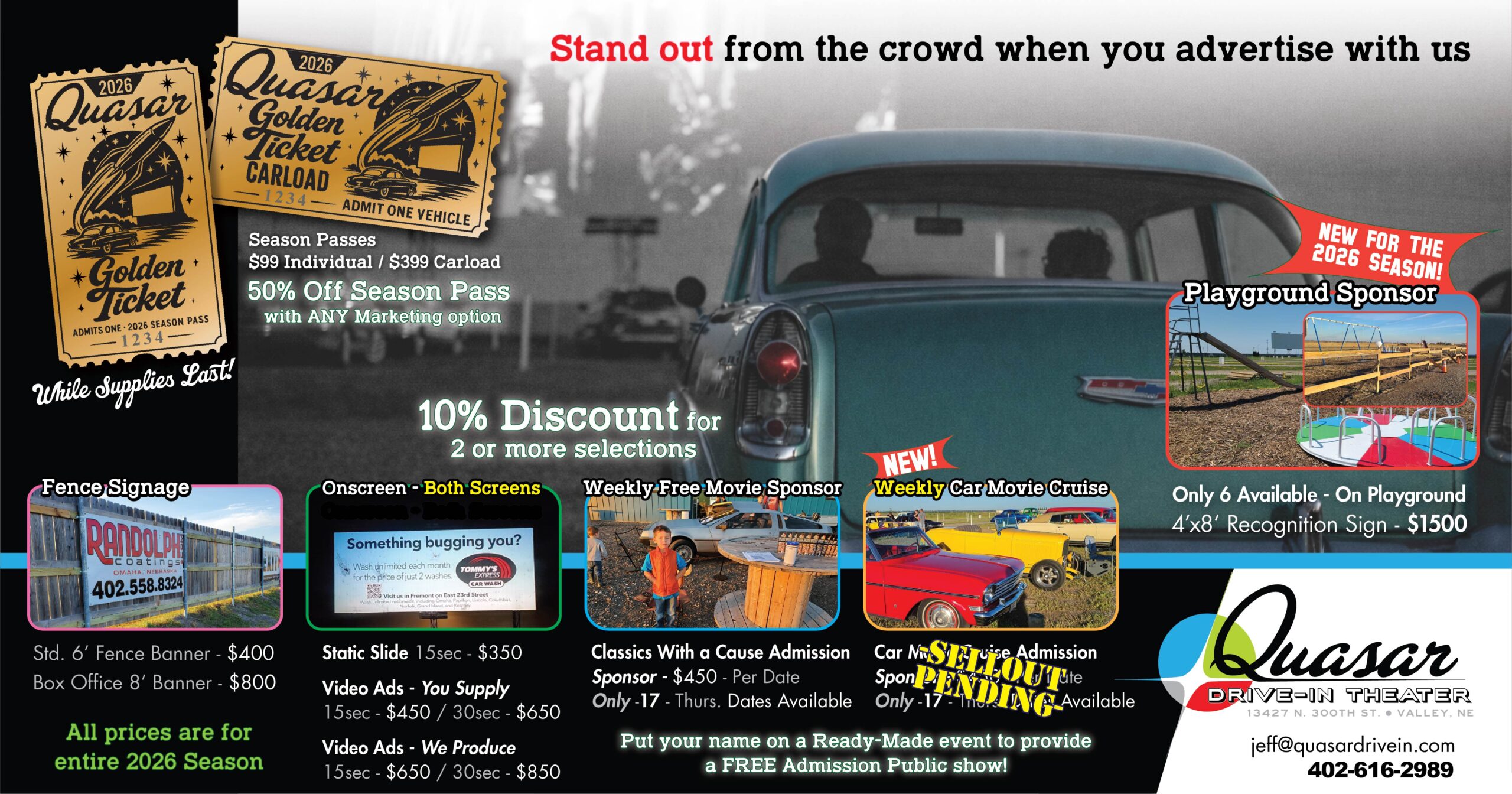 Make our network your network! Reach families across the metro and their favorite new gathering spot. We offer advertising packages from Fence-Line Signage (inside the gate) to On-Screen Advertising. Packages are for the entire season.
